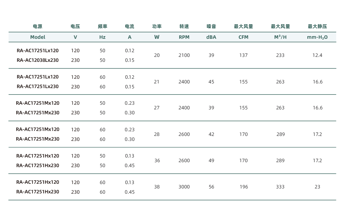 这款AC 17251轴流风扇尺寸为172*150*25毫米,具有坚固的铝合金框架和耐热的热塑性叶片,设计用于各种工业应用,如电子设备机柜、工业机械、以及展示柜等。风扇采用双滚珠轴承设计,确保风扇可以在高温和苛刻环境下长时间稳定运行,使用寿命长达70,000小时。其工作电压为110-120V或220-240V AC。此风扇还具有多种安装方式,支持水平或垂直安装,适用于需要高效散热的应用场景。