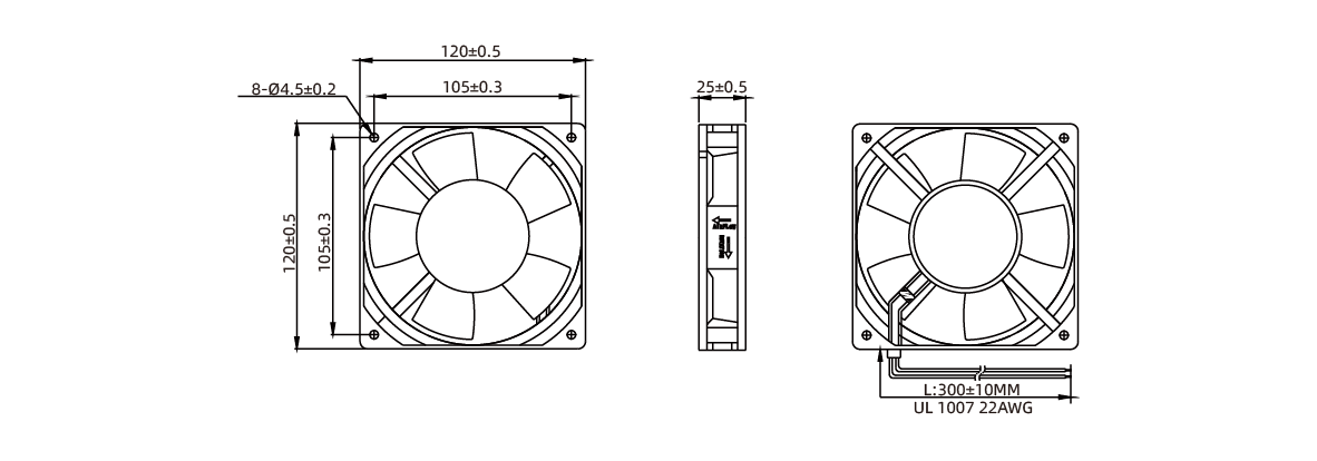 这款AC 12025轴流风扇尺寸为120*120*25毫米,具有坚固的铝合金框架和耐热的热塑性叶片,设计用于各种工业应用,如电子设备机柜、工业机械、以及展示柜等。风扇采用双滚珠轴承设计,确保风扇可以在高温和苛刻环境下长时间稳定运行,使用寿命长达70,000小时。其工作电压为110-120V或220-240V AC。此风扇还具有多种安装方式,支持水平或垂直安装,适用于需要高效散热的应用场景。